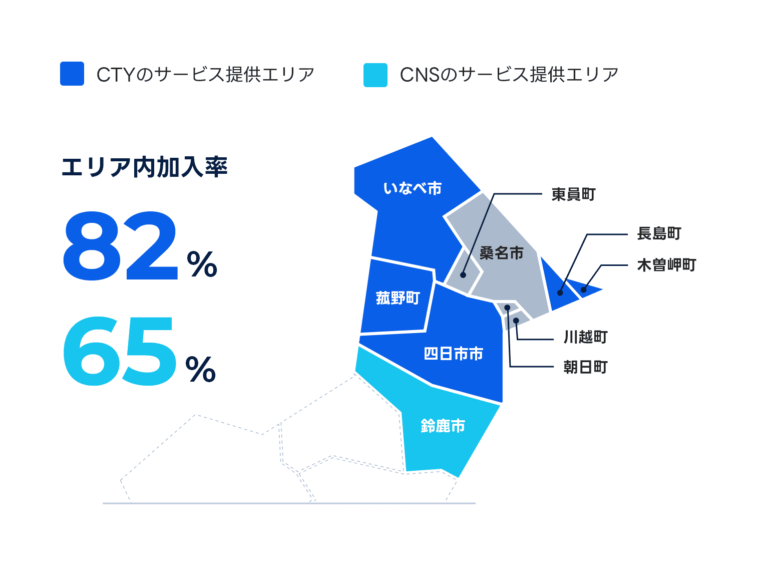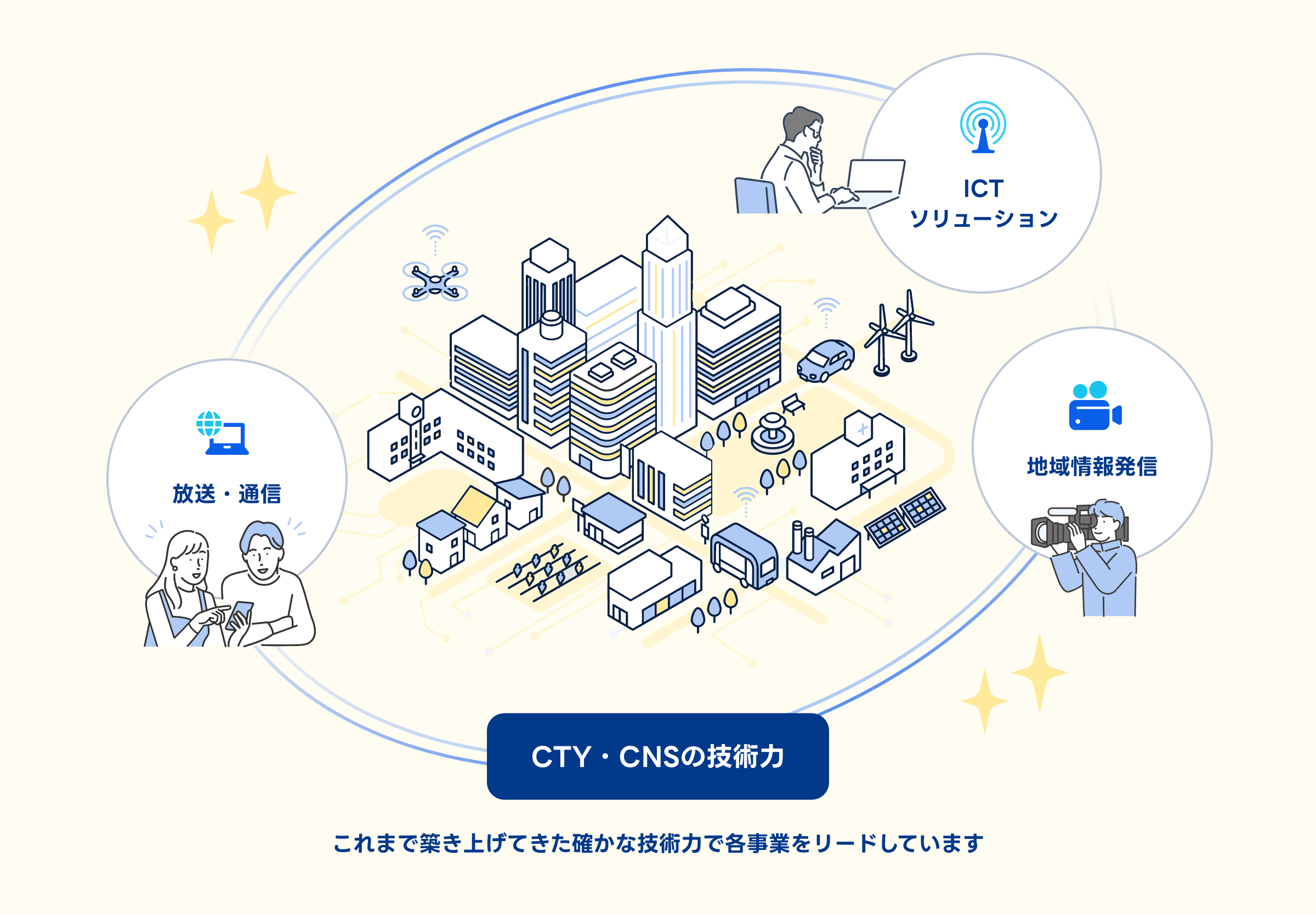 私たちCTY・CNSは、常にお客様に近いところで最良のサービスを提供することを使命とし、ケーブルテレビ(放送・通信)事業を核に、地域メディアとしての情報発信、最先端の情報通信技術を駆使したICTソリューション事業を展開する総合通信会社です。